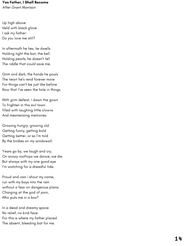 Next, a poem I really struggled with, “Yes Father, I Shall Become”, my attempt to pay homage to Grant Morrison’s time on Batman — focusing on Bruce and Damian. Morrison is a huge influence on me, so this was a big struggle, but I’m really proud of it.